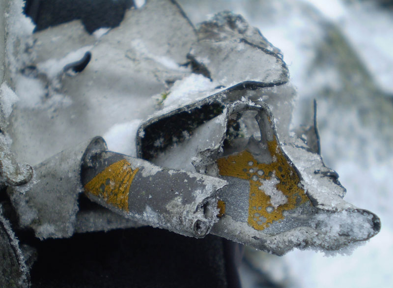 I located the crash site in October 2008 but with a fresh fall of snow on the steep scree it was not sensible to attempt a full search of the scree. On the first trip in 2008 I only found two pieces but one of these appeared to have small yellow stars painted on a grey background. The aircraft carried nose art and this small piece could well be part of this nose art "Flaming Mayme" and shows parts of some yellow stars.