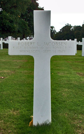 Radio Operator - S/Sgt Robert L Jacobsen (37168383), aged 30. Of St.Paul, Minnesota, USA. Buried Madingley Cemetery, Cambridge, England (E/6/61). Air Medal with Two Oak Leaf Clusters.