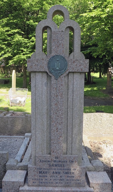 Samuel Smith's family owned the Ringtons Tea company. He was born on 8th July 1905 at Leeds, Yorkshire and worked for the family company. He gained his Royal Aero Club certificate (Cert.No.13991) at the Newcastle Aero Club on 26th June 1936. Four days later on 30th June 1936 Samuel Smith was the pilot of Gipsy Moth G-EBYV on a flight over the Weardale area when he became lost in poor weather, while force landing the aircraft crashed at Glebe Farm, Medomsley, near Consett, Co.Durham, he escaped serious injury but the aircraft was destroyed. On 6th March 1937 he crashed Tiger Moth G-AELA "The Ringtonian" near Newcastle aerodrome and again was unhurt. In the week before the fatal accident near Keswick it was reported in his inquest that he crashed a (unidentified) Newcastle Aero Club aircraft. Vega Gull G-AFGU was registered to Samuel Smith, Rington's Ltd on 19th April 1938 - he had been given the Vega Gull by his father in the weeks before the accident at Keswick. I thank Mr D.Wood for kindly supplying a photograph of his gravestone.