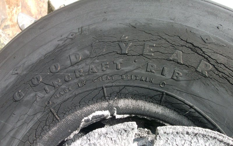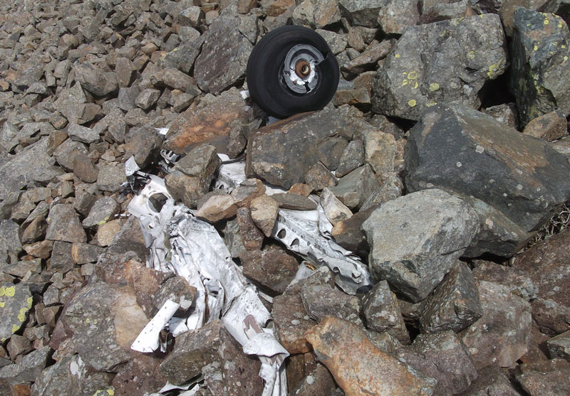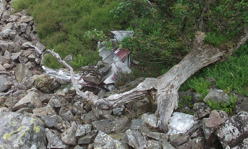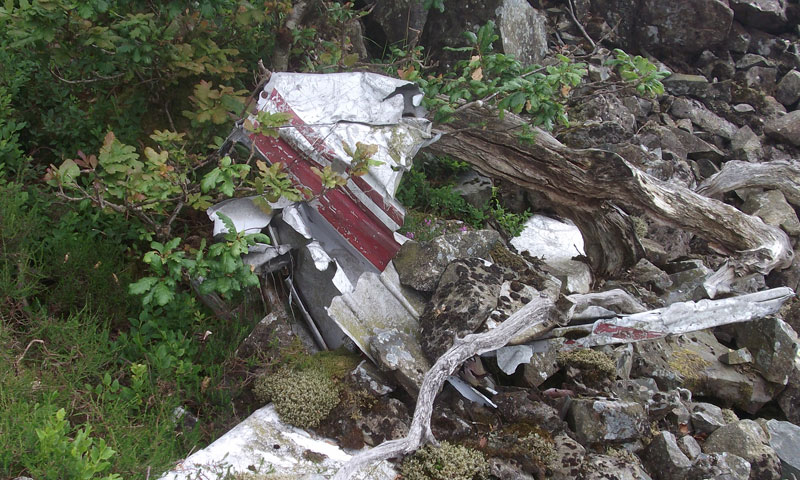 The tail section of the aircraft partly covered by rocks. The colour scheme of G-AZYP appears very similiar to that of G-ASEK that crashed at Esk Hause in 1966.