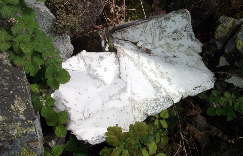One of the smaller fragments of the aircraft's skinning near the shore of the lake.