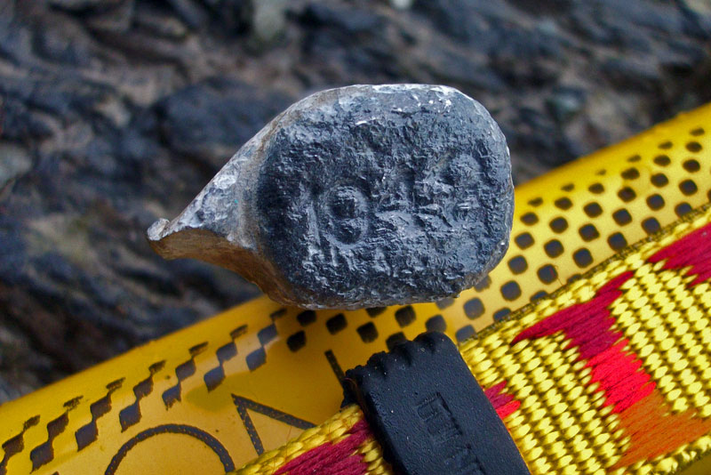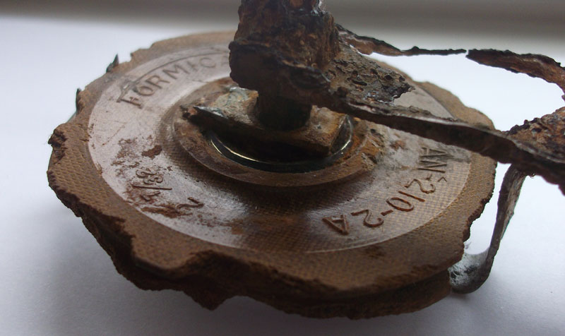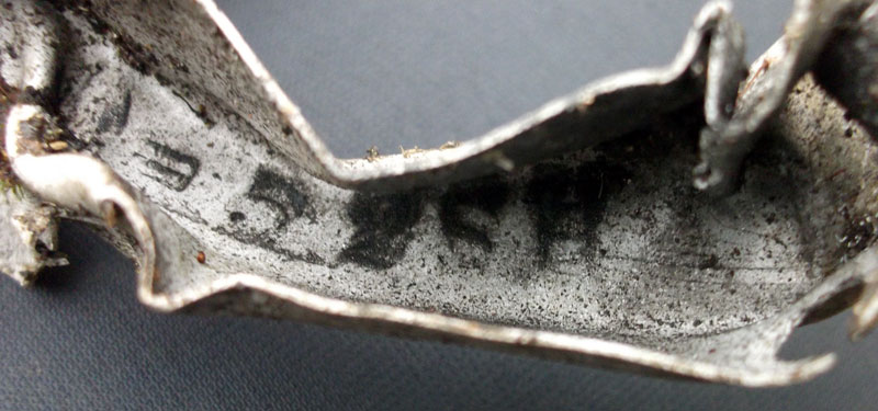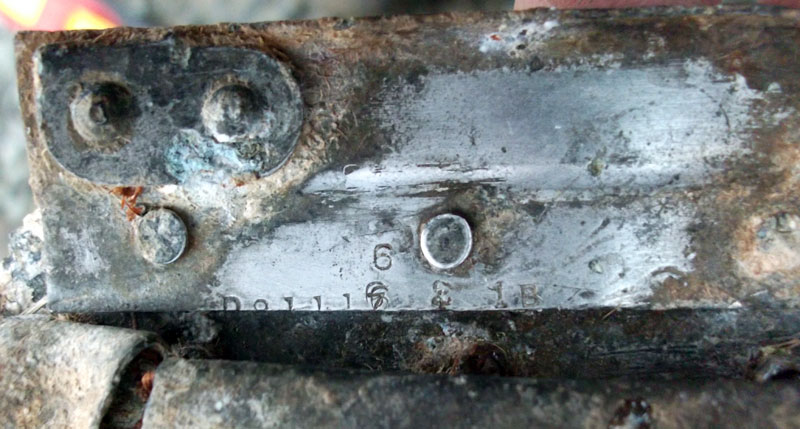If the bodged piece detailed above is a re-used piece then this item here is a similar item, the photograph shows a manufacturing number shown on the section below. It seems to have been a re-used piece of metal as the stamp is cut through. Possible numbering should read "B81116 4 1B".