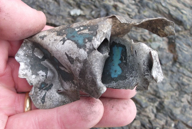 A very crumpled section of aircraft skinning, it's hard to say if this colour was internal or external.