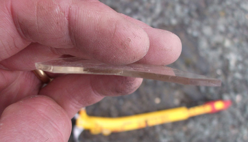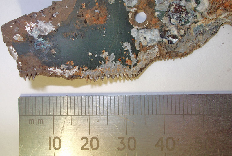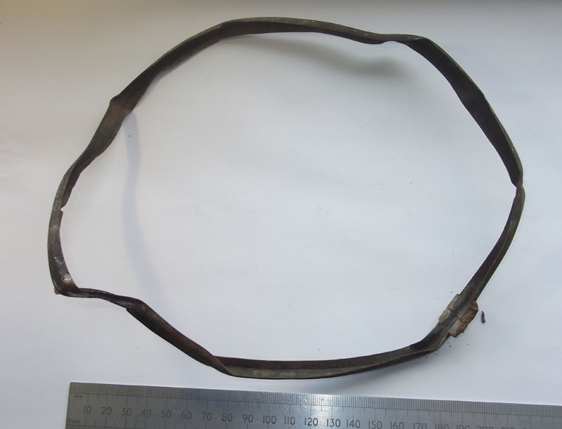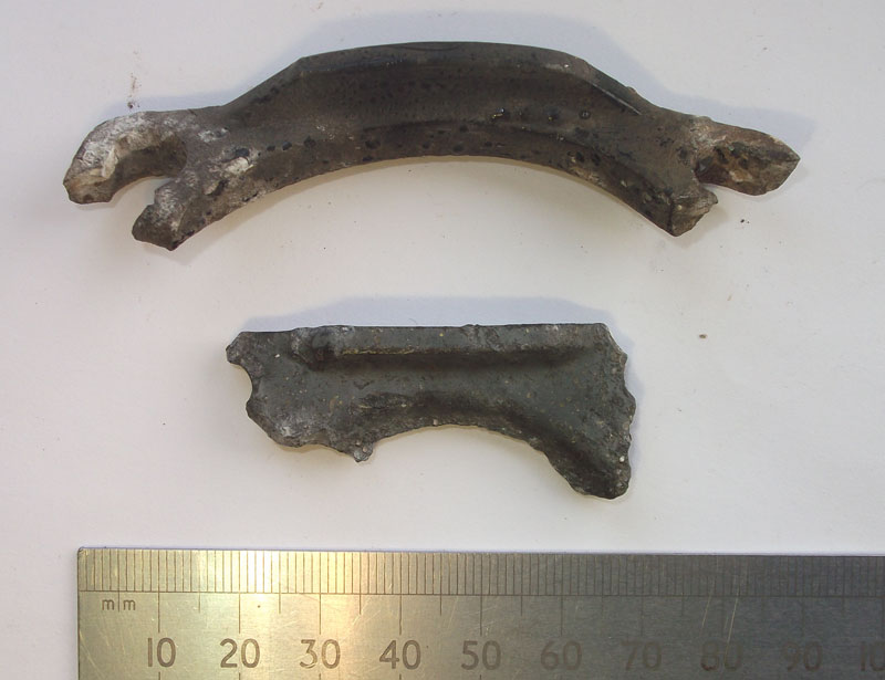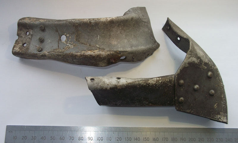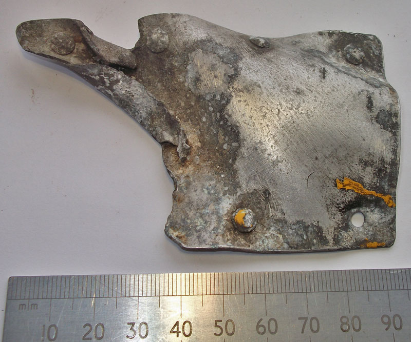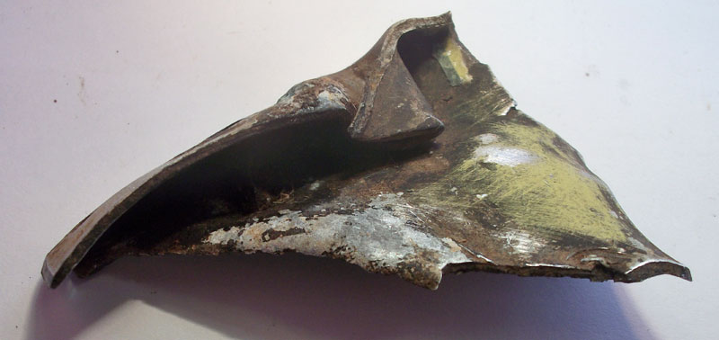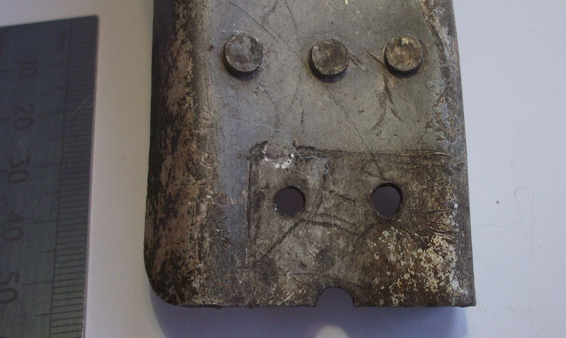 These two pieces have the same dimension of bend on them and could well be pieces of the airframe structure or engine cowling. The lower pieces seems normal with a factory produced item however on the upper piece the left side rivit hole on the edge is not on a tear in the metal but across a delibrately cut edge, it can't surely have come out of the factory like this? The sides of this cut have been rounded off with a file but the roundings are not the same. It appears to have been a longer section made smaller after production. The three rivits on this item have been put through the holes the opposite way round to the lower piece.
