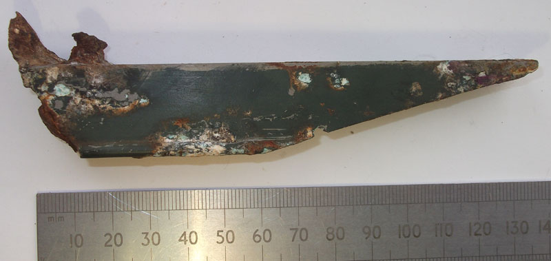 Examples of the colours of paint found. The top photograph shows part of a stringer with the distinct rounded edging and with yellow paint on what must therefore have been the outside of the aircraft. There are flakes of yellow paint near to the point of impact at the crash site shown on the second photograph. This stringer is identical to examples of Beechcraft Model 18 stringers shown on the internet in both modern photographs and in repair manuals. The photograph below shows more yellow paint.
