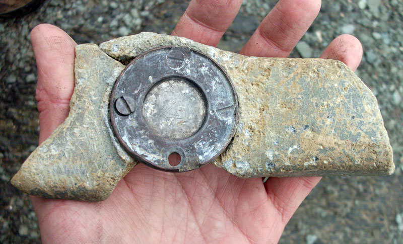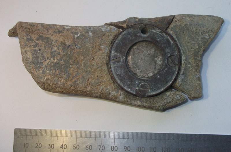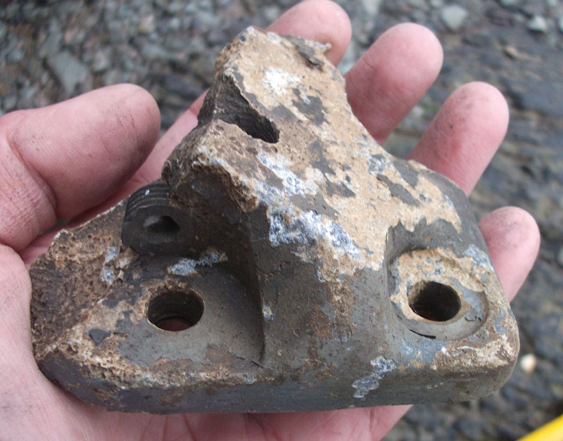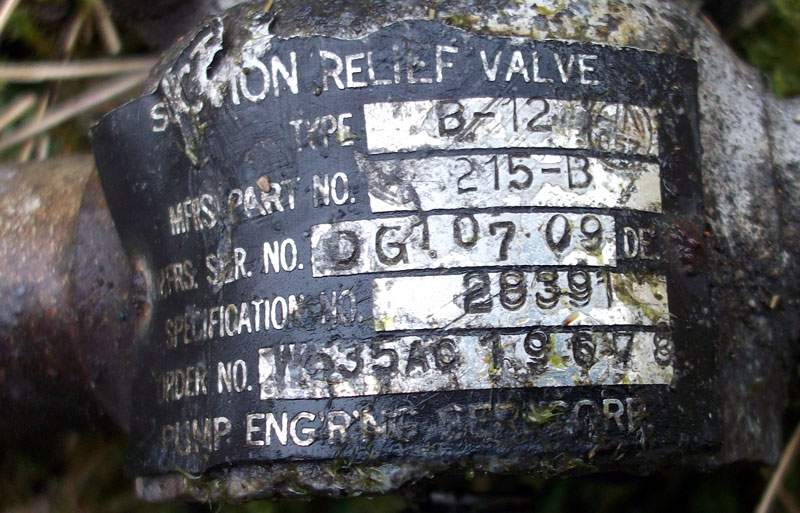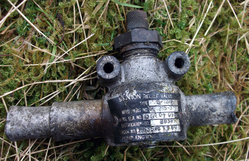 A suction relief valve found in rocks at the crash site, these were used on many of Pratt and Whitney engines. I am informed that this was probably manufactured after June 1941 when the prototype is known to have been made, this would date the engine to after this date.