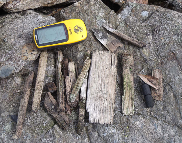 Pieces of the aircraft's wooden structure also found in rocks with the Garmin GPS for scale.