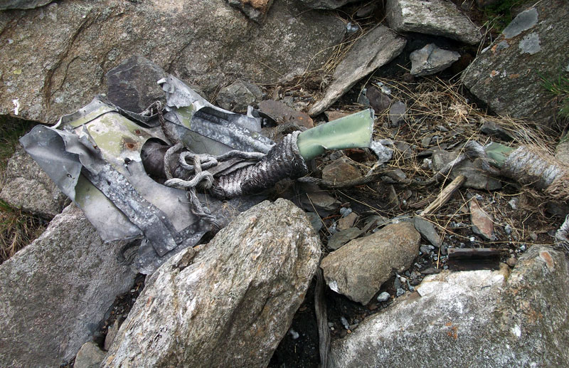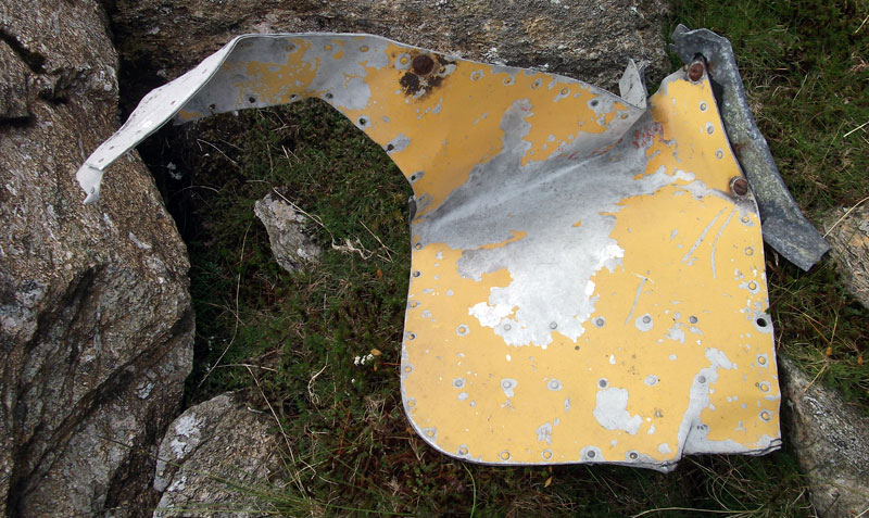 A large yellow painted panel in scree below the crash site.