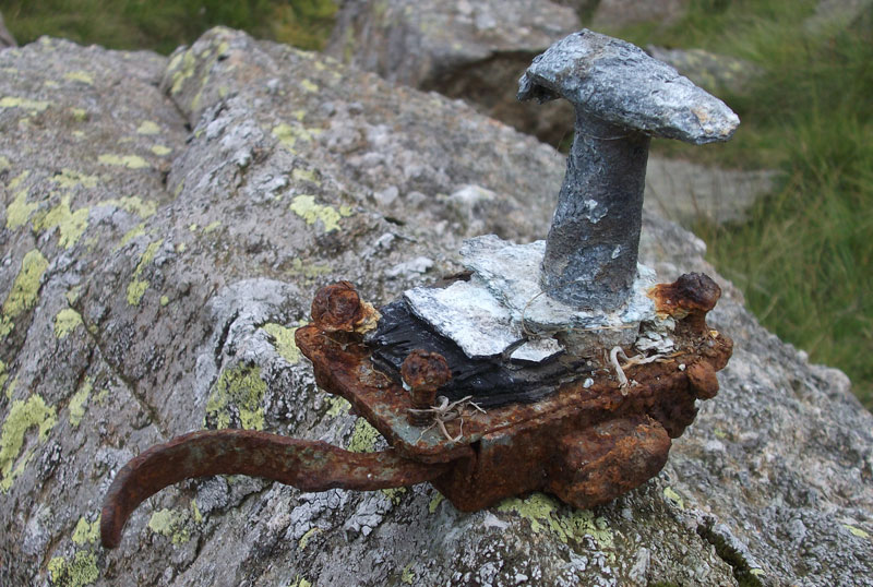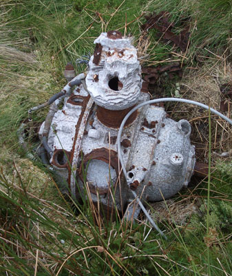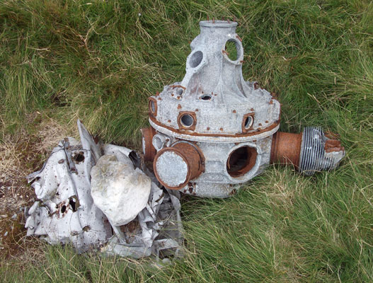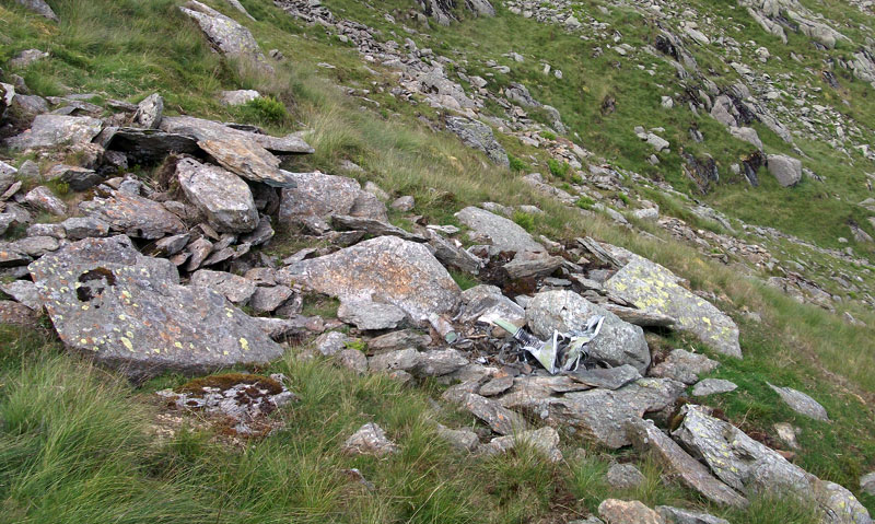 This was the first ever crash site that I attempted to locate back in Autumn 1996 with Ben Thompson and Steve Sutherland, not exactly knowing where we were going we eventually located one of the two engines in the stream below the crash site before retreating to Coniston due to failing light. Since 1996 I located the second engine in 1997 and have passed them both numerous times since then. Over the last eighteen years they've moved around slightly to where they were last seen in July 2014. On one of my return trips with Will Lund in 2002 we went up the fellside to attempt to locate the actual crash site and found an area close to the impact point where a small amount of burnt wreckage remains. I descended from the ridge down to the crash site in July 2014 and feeling more brave climbed up to the point of impact where small remains of the aircraft are wedged in rocks.