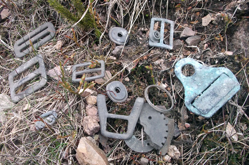 A number of aircrew fasteners and buckles found in scree at the crash site in May 2012. The nephew of P/O Cooper, Mr John Kirkby, took these back to Canada.