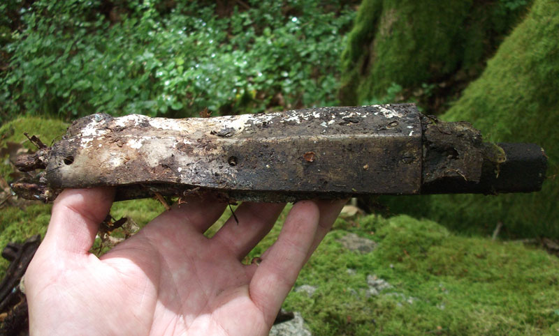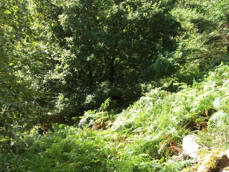 Pine woodland was planted across the hillside in the years after the war and many of the trees are now mature, the crash site seems to have been spared from the pine trees but a number of well established mature broad leaved trees have since grown up over the crash site. In Summer 2013 when I visited the site was also covered by bracken being guided there by military historian Mr Ade Harris who had spent many hours locating the site earlier in the year when the bracken had died back.