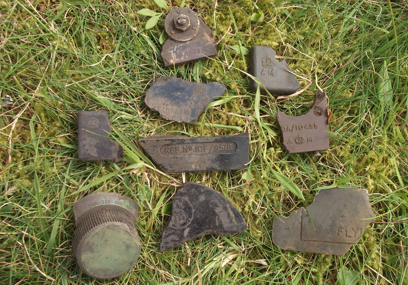 A collection of bakerlite fragments found at the crash site showing numerous Air Ministry reference numbers.