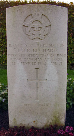 Wireless Operator / Air Gunner - F/Sgt Louis Joseph Raymond Bechard RCAF (R/55401), aged 21, of Quebec City, Canada. Buried Silloth Cemetery, Cumbria.