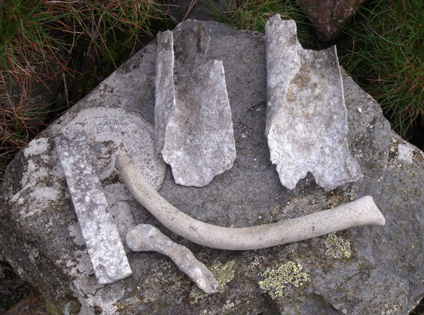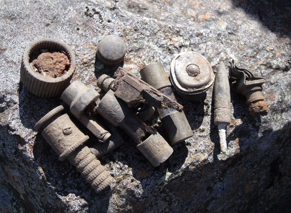 I located a small number of parts of this aircraft in August 2010 but was already far to low down the mountain to have confirmed the crash location. The pieces I found were in scree and had clearly initially come from much higher up but had fallen with the scree in the sixty years since the crash. The photograph below shows these pieces. In April 2011 I returned to the area and located the main crash site much higher up the mountain.