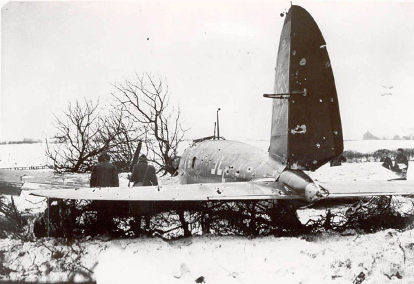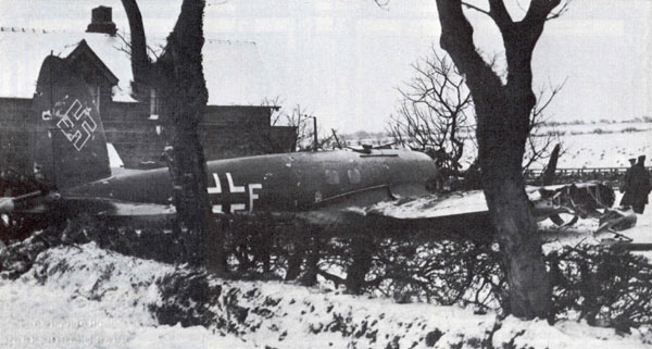 This aircraft flew with one other until around sixty miles off the English coast when they became seperated when they flew in or just below clouds at 1,200 feet. It was first picked up by the Danby Beacon Chain Home system at 09.03hrs around the same distance from the coast and allied fighters were scrambled to intercept these aircraft. During later interogation the crew of this Heinklel stated that as they approached the coast they saw the shadowy forms of ships below them through the mist and that one was recognised as a destroyer. They stated that before they could make an attack on the ships and while flying at a thousand feet the Allied fighters located them at 09.40hrs. The three Hurricanes were piloted by F/Lt Peter Townsend (L2116), F/O Patrick Folkes (L1723) and Sgt Jim Hallowes (L1847), of 43 Squadron, based at Acklington. Townsend made the first attack and damaged the HeIII's starboard engine, his attack also struck the obsever (Leushake) in the head. Folkes was next to attack, his bullets damaged the fuselage and other engine. It also hit another German crewman in the stomach (Meyer), who later died from these injuries. Hallowes positioned himself clear but headed off any possible escape which the Heinkel's crew may have hoped for. The intelligence file states that when interviewed, the pilot stated they jettisoned their bombs as the attacks began rather than deliberately targeted ships though this may have been assumed by people on the ground. During the attacks that followed another airman (Missy), was shot in the leg, these injuries would later result in his foot being amputated. The Heinkel was by now severely damaged, the Luftwaffe pilot had no choice but to head toward land make a forced landing to attempt to save his crew. The aircraft flew very low across Whitby and out into the countryside beyond. By all accounts it had been shot at until it was on the ground. It narrowly missed flying into Bannial Flat Farm then crashed into the snow covered field beyond it, where upon it ploughed through field, a hedge and a tree and came to rest near the farm cottages at Bannial Flat Farm, Whitby. The observer may already have been dead in the aircraft prior to the crash landing but in striking the final tree with the nose of the aircraft would have also caused fatal injuries. Local people had already started to follow the stricken bomber even before it was on the ground, it was apparently so clear that it would crash soon after.