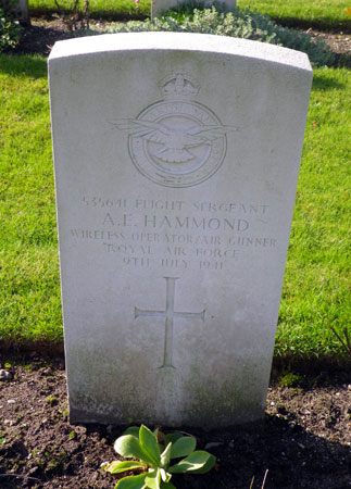 Albert Hammond was the son of Sgt Major Albert Edward and Mrs Annie Hammond and was born in Punjab, India in january 1919. In 1941 his parents were living in Cleethorpes, Lincolnshire but as Albert is commemorated on the Ipswich War Memorial this suggests the family had links there as well. He had already survived the crash landing of Whitley P4942 at Appleton le Street, near Malton in September 1940. He also survived the crash of Halifax L9498 at Linton on Ouse in June 1941. F/Sgt Hammond was later posted to 35 Squadron and was killed on 9th July 1941 when Halifax L9521 was shot down over The Netherlands, the aircraft sadly crashed onto a house killing three crew including him as well as four people in the house. He is buried at Uden War Cemetery, Noord-Brabant, Netherlands.