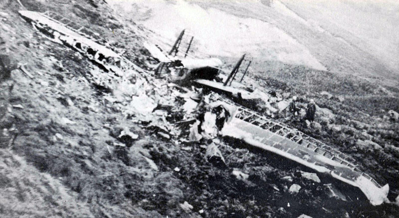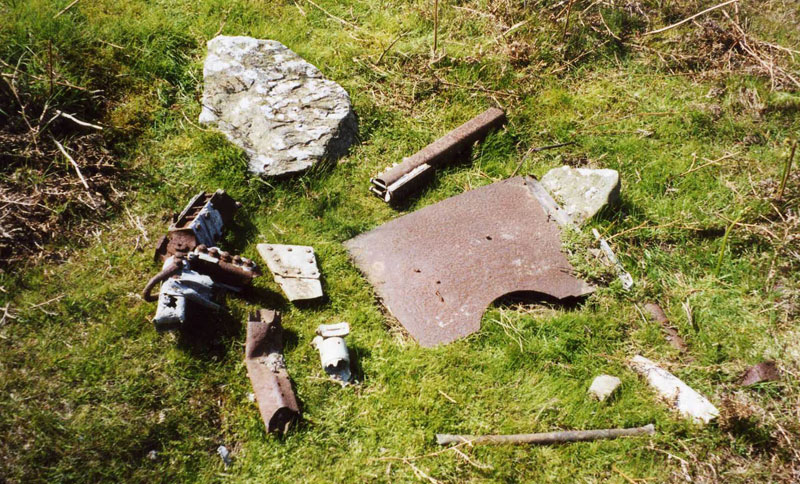The RAF took what they wanted from the aircraft after the crash but after the War a local farmer sledded some of the larger remains away, possibly cashing it in with the scrap man. A number of years later the new tenant farmer at the same farm did the same with more of the aircraft's remains. I contacted the son of this second farmer in 2004 and he was led to believe that Sgt Green survived the actual crash after being thrown from the plane during the crash. Although this prolonged his life only slightly it saved him from being killed in the aircraft on impact. The same farmer also told me that a land slip occurred from above where the aircraft crashed as a result of the crash. The photograph taken at the time (shown below) does seem to agree with this as there seems to be large rocks in the foreground of the photo.