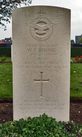 Sgt William Young cannot have been seriously injured in the crash detailed above as he was sadly killed less than a month later on 15th December 1941 when 50 Squadron Hampden AE380 crashed into the sea off Belgium. His body was recovered and he is buried at Ostend New Communal Cemetery. He was twenty two years old. His then crew were never found and are commemorated on the Runnymede Memorial. Thanks to Ade Harris for photographing his grave.
