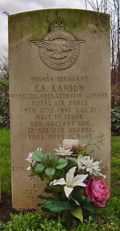 Wireless Operator / Air Gunner - Sgt Charles Frederick Ranson RAFVR (950534), aged 21, of Ilford. Buried Manor Park Cemetery, Essex.