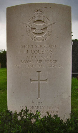 Rear Gunner - Sgt James Cousins RAF (534871), aged 24, of Stoke Newington, London. Buried Dishforth Cemetery, Yorkshire.