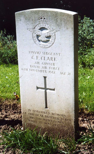 Mid Upper Gunner - Sgt Charles Frederick Clark RAFVR (1395017), aged 21, of Charlton, London. Buried Newton on Ouse Churchyard, Yorkshire.