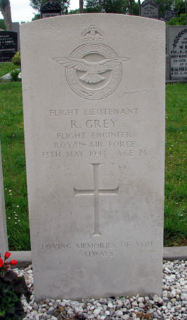 Robert Grey was born on 13th June 1917 at Ashington and enlisted for RAF service on 25th August 1936. He received a commission on 19th January 1943 to the rank of P/O on probation (emergency). While in the rank of Acting F/Lt was sadly killed on 13th May 1943 when 78 Squadron Halifax JB924 was shot down by a night-fighter over Holland on Ops to Bochum. He is buried at Barradeel, Netherlands and was twenty five years old. At the time of his death he was the Squadron's Flight Engineer Officer. The photograph shown here of his grave was published to the internet by Frans Jeugdouderling.