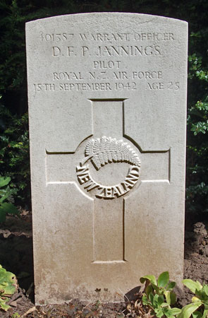 Pilot - W/O Derek Frederick Paterson Jannings RNZAF (NZ.401387), aged 25, of Wellington, New Zealand. Buried Driffield Cemetery, Yorkshire.