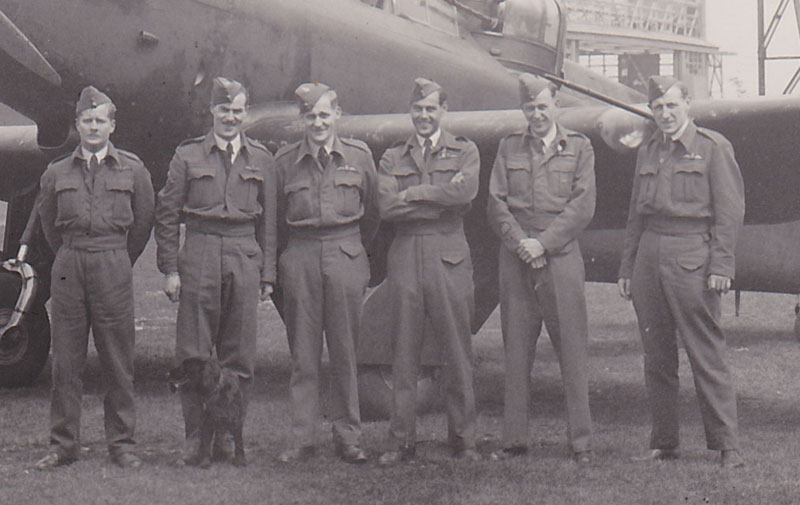 Left to right: Ross Hardie, Bill Hogg (and dog "Joe"), John Junker, F/Lt Wynyard Wright, Derek Jannings, Derek Lord.
