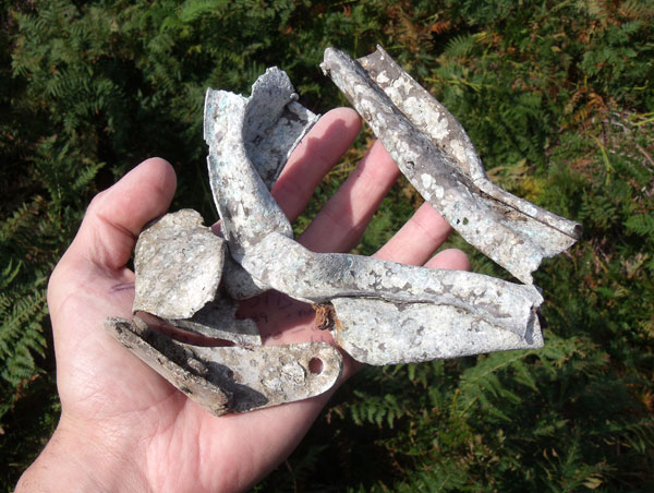 I was very fortunate to be put in contact with Mr William Wood in 2003, formerly of Ewe Cote, but then retired and living in Helmsley. He and his brother heard this crash happen, they went to through their fields to see what had happened. There were small fires burning everywhere with the odd bullet popping in these fires. On arriving they were not the first there, two RAF personnel who were staying at Sportsman's Hall and in the process of dismantling the crashed Halifax at Low Thwaites were the first there. These men told Mr Wood that the aircraft was German. He also thought the aircraft may have been shot at before it struck the moor and had lost height in order to avoid this gun fire. This prior damage does seem unlikely.