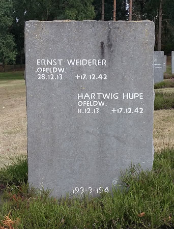A wreath lay in Hawnby Church for many years in memory of the four German airmen who died in this crash. The pilot's daughter visited the crash after the War, she was only a baby when her father was killed here. It is thought the wreath in Hawnby Church was put here on her behalf and every Rememberance Day the four Luftwaffe airmen are remembered in Hawnby. A Dalesman article states that Mr Brian Rapier made contact with at least one family of one airman in this crash. I will therefore make the assumption that it was his efforts which resulted in this wreaths existance at Hawnby. The body of Obfw Hartwig Hupe was initially buried at Dishforth but was unidentified. He was later exhumed, identified and reburied under his full name in Cannock Chase Cemetery, Staffordshire. Obfw Ernst Weiderer was also initially buried at Dishforth but also exhumed and re-buried in Cannock Chase Cemetery, Staffordshire.