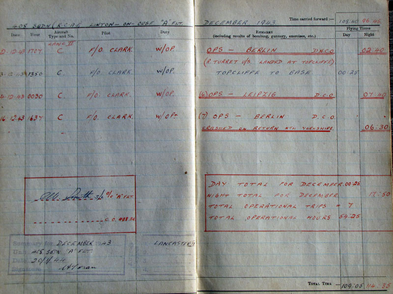 x - 2nd/3rd December 1943, Lancaster "C" (DS737), Ops to Berlin, 02.40hrs. Returned early because rear turret was un-serviceable, landed Topcliffe (did not count). Returned to base the following day.
