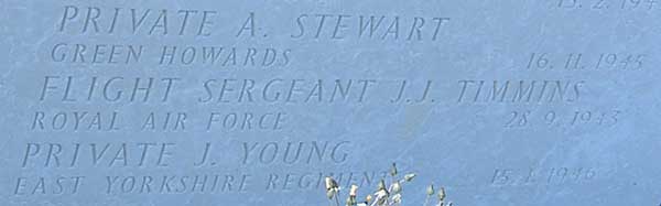 F/Sgt Jim Timmins was buried at St Patrick's Churchyard in High Spen, County Durham on 2nd October 1943 not at Winlaton Churchyard as the CWGC database states, Winlaton is three miles from the actual location. In the 1970s the St Patrick's Churchyard suffered from subsidence and land slippage. Sadly all the gravestones were removed and destroyed but the graveyard was made stable, landscaped and then grassed. In the 1960s an engraved stone was placed on a wall of Hookergate Cemetery, a civil cemetery on land ajoining the church. This plaque carries the names of the War-dead buried there. John Timmins had a squadron nickname of "Geordie". Prior to enlisting into the RAFVR John Timmins (of Derwent Dene, Orchard Avenue, Rowlands Gill) volunteered as a Messenger in the ARP where he lived. This would envolved riding motorcycles and carrying messages over greater distance when necessary. Timmins also worked either making or selling leather goods during the same period. Such messengers were usually Boy Scouts, or older men with cars. He was also a member of 1072 Squadron ATC, he apparently joined 1664 HCU direct from the ATC. He was carried by members of the ATC squadron at his funeral. My thanks to Mr Brian Pears for much of this information on F/Sgt Timmins and for the photos of the memorial shown above.