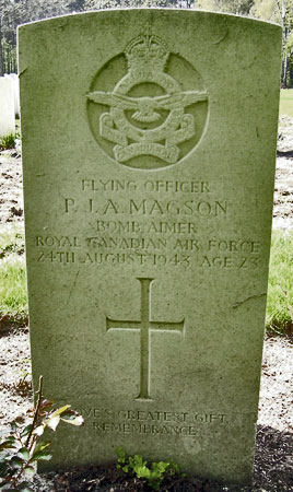 His brothers were probably P/O Robert A V Magson (J/14693) and Lloyd Magson (probably navigator P/O Lloyd Truscott Magson RCAF (J/87446)) who served with 420 Squadron and survived the crash at White Waltham airfield on 30th July 1944 to Halifax NA528. Also onboard NA528 on this date was Sgt F V Harvey who had himself survived the crash of Halifax LW396 near Raskelf, Yorkshire in February 1944. Lloyd Magson died in October 2006.