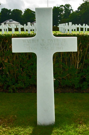 Passanger / Mechanic - Cpl Walter Tecumseh Dyer Jr USAAF (38115782), of Montague County, Texas, USA. Initially buried Brookwood Cemetery, London. Re-buried Cambridge Madingley Cemetery, (D/1/58).
