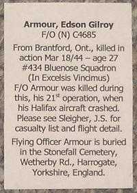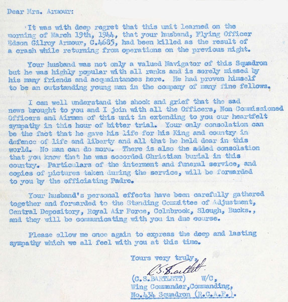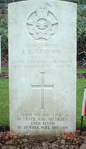 Edson Armour's flying career was two fold. He was three and a half years into the Mechanical Engineering Degree when he enlisted for RCAF service. He initially applied to join the RCAF by letter in October 1939 but appears to have been unsuccessful (or a reply was not forthcoming) so he then re-applied to enlist for RCAF service for flying duties on 10th June 1940 but at that time was deemed suitable only for ground duties due to a medical condition. He had begun working for his father's buisness designing heating systems during college holidays and in the period between enlisting and being called up for service. Having re-mustered to ground duties and being technically qualified he received a commission to the rank of F/O on 28th March 1941 (non-flying). He served as officer in charge of operations at an anti-submarine RCAF base at Dartmouth, Nova Scotia. His wife and son were able to live with him at Dartmouth. He was promoted to Acting F/Lt on 1st May 1942. During his time at Dartmouth he did not fly, which in some respects this job would have been an easy one but he had wanted to fly and serve overseas so he re-mustered back to aircrew on 24th October 1942. He trained as a navigator at London, Ontario at No.4 AOS and qualified as a navigator on 19th February 1943. Having re-mustered to aircrew when he graduated he was re-graded to the rank of P/O on the "General List" on 19th February 1943, he would have had to do this in order to fly. He was then posted to the UK to continue his training, arriving in the UK in March 1943 he firstly trained at 4 (O)AFU beginning 15th March 1943, 23 OTU at Pershore, Worcestershire beginning 22nd June 1943, 1659 HCU at Topcliffe beginning 28th September 1943 and was then posted to 434 Squadron 26th October 1943 with his crew. He would become known to his crew as "The Old Man", at twenty seven years old when he was killed he was by far the eldest member of the crew, this was a sad fact of war but he was still no age. He was buried alongside the other Canadian members of his crew and with nearly 1000 other Commonwealth aircrew at Harrogate Stonefall Cemetery, Yorkshire.