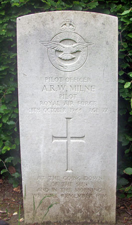 Pilot - P/O Alfred Robert William Milne RAFVR (186495), aged 22, of Mitcham, Surrey. Buried London Road Cemetery, Mitcham, Surrey.