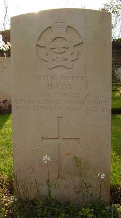 Rear Gunner - F/O Henry Cox RCAF (J/27318), aged 26, of Comox, British Columbia, Canada. Buried Harrogate Stonefall Cemetery, Yorkshire (C/J/16).