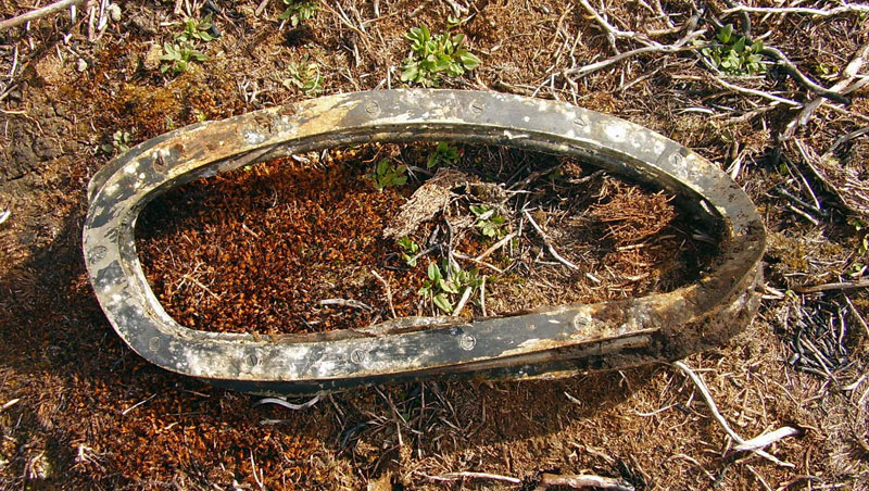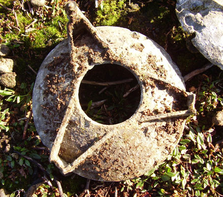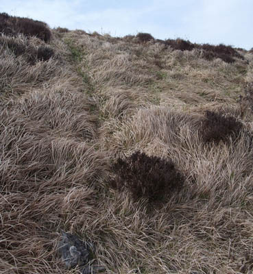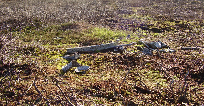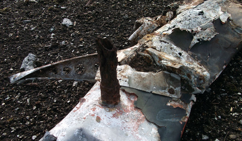 This photograph shows where I believe the aircraft first struck the ground with a wing and created this mark in the ground leaving small fragments behind. The propeller covering shown above right was found in this area as well as other items.