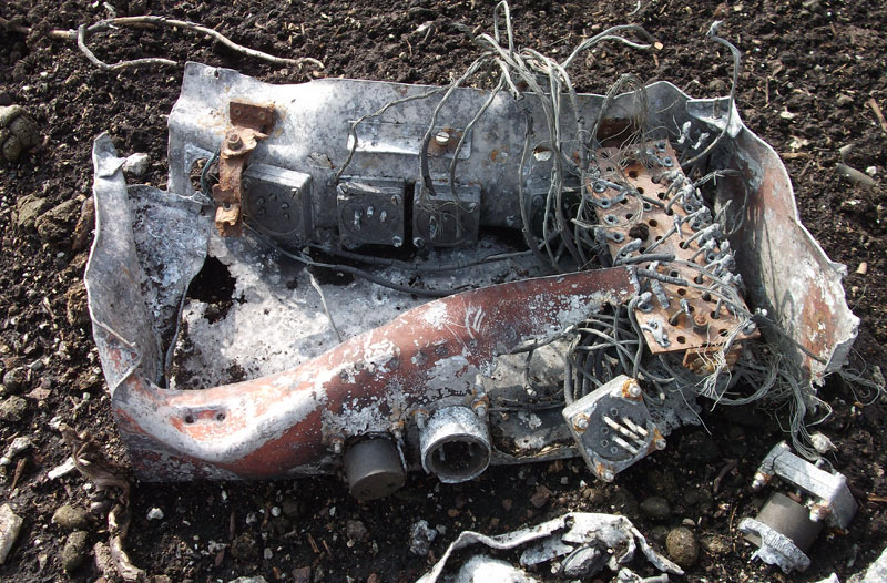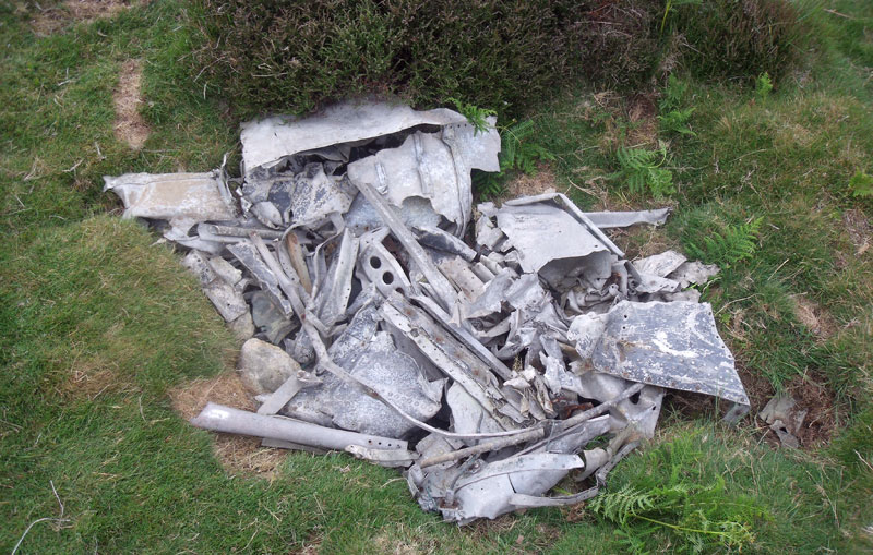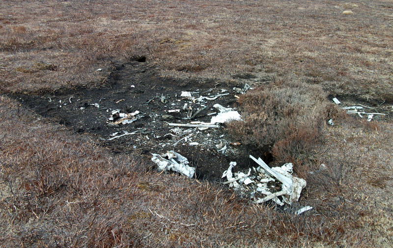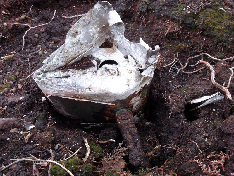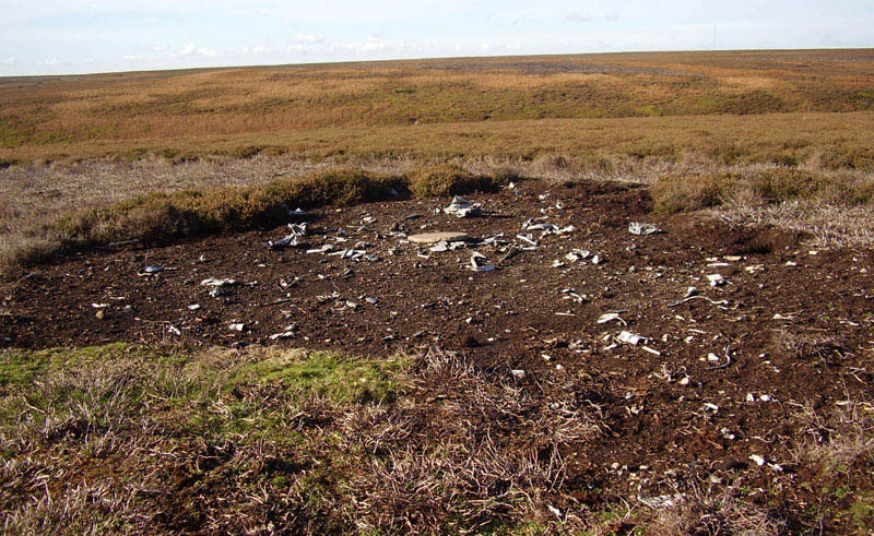 This photograph shows the area of where the largest of the fires occurred at the crash site and may well be where the RAF collected and set fire to what remained of the aircraft or the result of a large post-crash fire. In this area are hundreds of exploded .303 bullet cases and numerous other tiny pieces of the aircraft. When I located the site in 2003 there was a very tiny secondary area containing a few pieces of the aircraft, since my first visit this area has clearly been made much larger by someone digging the ground up around it and a lot of pieces of the aircraft are now to be seen. In 2006 I visited again after the whole site had had the heather burnt off for grouse breeding, I discovered a new area of wreckage at the far end of what must have been a long wreckage trail. I walked between all the known areas of wreckage to search for other stray items and found further interesting items including the bomb aimer's glazed window from the very front of the aircraft and this would probably prove that the aircraft did not strike the ground nose-first as one would expect this to be at the very start of the crash sequence and not towards the end of it.
