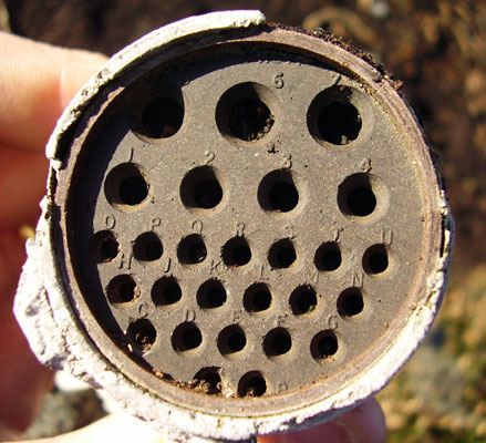 Part of a parachute pack (left) and (right) a large electrical connector.