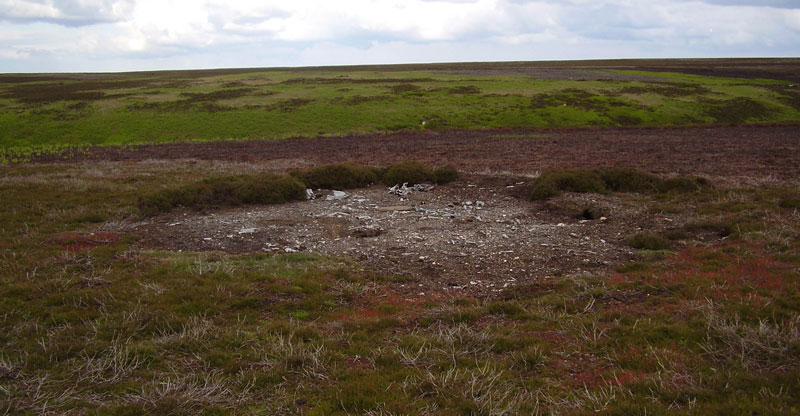 Halifax LL178 struck an area of high ground to the west of Arden Hall, near Hawnby in North Yorkshire and the point in which the aircraft initially hit was near the top of a steep grassy bank and was only feet from clearing the highest part of the ground had the aircraft been flying in level flight. The aircraft crashed onto the moorland on the horizon as shown in the photograph above. The crash report states that level flight was not being attained moments before the crash which can be appreciated once the crash location has been found as it is surrounded by slightly higher ground on the side it approached from. Some of the events in the hours following the crash have been located in a No.6 Group flying control log found in IBCC archives. The first record of it having crashed was made at 23.24hrs with the location being given as near Arden Hall and the aeroplane simply believed to be 434/C (ie 434 Squadron /"-C"). By 23.30hrs Topcliffe airfield sent out their crash tender, Wombleton airfield sent their ambulance and Thirsk and Helmsley NFS and police were despatched toward the crash. Skipton on Swale airfield warned that it would be their responsibility to guard the crash site but had no crash tender to send. At 04.30hrs on 18th March 1944 it was still not positively identified as being Halifax LL178 although seven dead airmen had been located. By 08.00hrs the bodies were searched and identified which then positively the wreckage as being LL178. Topcliffe airfield sent their ambulance to recover the bodies but could not locate the crash site so returned to Topcliffe. Skipton on Swale airfield also sent their ambulance and reported that when they located the site Topcliffe's crew were not there but eventually arrived. The bodies of the eight men were carried a mile to the nearest road and then driven to Topcliffe airfield prior to transfer back to Croft. One assumes the normal routine followed in respect of a guard placed on the site prior to the RAF clearing the site of all recoverable useless larger pieces of the aircraft and equipment. Given the nature of the crash the usable equipment was probably minimal. The remaining larger pieces of airframe would have been cut up and removed, burnt on site or buried on site and in this case all three methods appear to have been used. The heather around the crash site would recover in time and now the site is virtually unnoticable to the casual passer-by from public footpaths that pass close to the crash site.