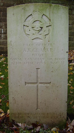 Pilot - P/O Arthur Kenneth Clarke RCAF (J/89944), aged 22, of Hawkstone, Simcoe County, Ontario, Canada. Buried Harrogate Stonefall Cemetery, Yorkshire.