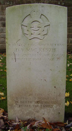 David Mackenzie and his gravestone. The photograph to the left was found on the Canadian Virtual War Memorial with whom I have contributed information regarding other casualties. David MacKenzie was born on 24th May 1940 in Leader, Saskatchewan and was the son of Robert Colin and Mary Marshall (nee Badger) MacKenzie. His father was born in Ireland and mother born in Scotland. After attending school in Saskatchewan he took a job ranching at Lundbreck, Alberta but later returned to Saskatchewan undertaking farmwork and breaking horses. He enlisted into the RCAF in Regina on 1st December 1941. His brother James Alexander MacKenzie served in the Royal Canadian Engineers and brother John Badger MacKenzie served in the RCAF as groundcrew. His father also served in the RCAF in WW2 as part of a maintenance unit. Having trained as an aero engine mechanic and initially serving in Canada David left to serve overseas, he sailed by boat from New York to the UK arriving on 11th January 1944. He was posted to 432 Squadron on 9th February 1944.