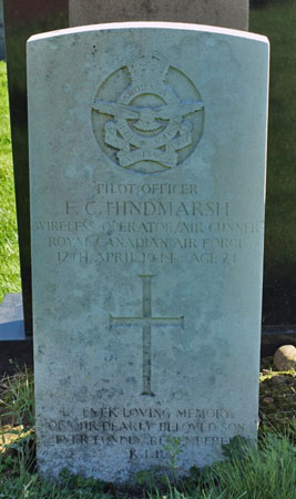 Felix Hindmarsh was born in Edinburgh, Scotland on 10th April 1920 and was the son of Andrew and Catherine (nee Lafferty) Hindmarsh. His father was born in Bedlington, Northumberland and his mother was born in Edinburgh. The family appear to have sailed to Canada in 1926 arriving in Quebec but setting up home in Edam, Saskatchewan, Canada where Felix attended school. As a young man he worked for C.N. Railways, Saskatchewan from 1938 to 1940 and then as a lathe operator for General Motors, in St.Catherines, Ontario from 1940. He enlisted into the RCAF in Toronto on 21st July 1941 and at that time was living in Merritton area of St.Catharines, Ontario. With training in Canada later completed he was posted overseas in July 1943 and continued his Bomber Command training at 9(O)AFU (beginning 3rd August 1943), 24 OTU (beginning 7th September 1943) and Dalton Battle School (beginning 4th December 1943) and later to 1659 HCU at Topcliffe during January 1944. He was posted to 432 Squadron on 10th February 1944 with the rest of Kenneth Clarke's crew. He was granted a commission after his death and back dated to 11th April 1944. Felix had two brothers who served in the Canadian forces during WW2. Andrew Hindmarsh served in England with the RCAF and flew with 408 Squadron while his brother Thomas served in the Canadian Army. His brother Andrew Hindmarsh erected a plaque on the Edam War Memorial in 1990 to commemorate Felix Hindmarsh. Andrew Hindmarsh died in January 1991 aged 69 years. His gravestone photograph was posted to the internet by "StephenC".