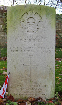 Douglas Thicke was the son of Frank and Margaret Thicke, of Ladysmith, British Columbia, Canada. Information regarding Doug Thicke's life and early flying career is not yet known. At the time of the fatal accident he was coming to the end of his Heavy Conversion Unit training with 1664 HCU and taking part in this raid with the Evans crew in preparation for him and his own crew joining an operational squadron. This flight, known as a "Dickie" flight was to give him operational experience, he was acting as second pilot to David Evans and would have flown in the foldable second pilot's seat in the cockpit of the aircraft. He was twenty one years old when he was killed in the crash near Kepwick Bank and was buried at Harrogate Stonefall Cemetery, Yorkshire.