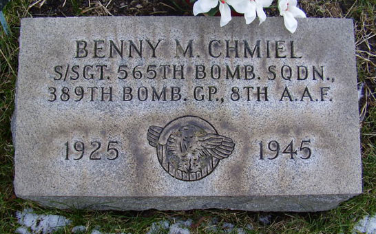 Left Waist Gunner - S/Sgt Benny Martin Chmiel USAAF, of Washington, Washington County, Pennsylvania, USA. Initially buried Cambridge Madingley Cemetery. Since buried in Holy Trinity Polish National Catholic Church Cemetery, Washington, Pennsylvania, USA.