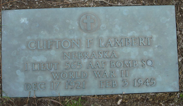 Pilot - 2Lt Clifton Frank Lambert USAAF (O-824144), of Lancaster County, Nebraska, USA. Initially buried Cambridge Madingley Cemetery. Since buried in Lincoln Memorial Park, Nebraska, USA. Wife of Lincoln, Nebraska. Died of injuries on 3rd February 1945.