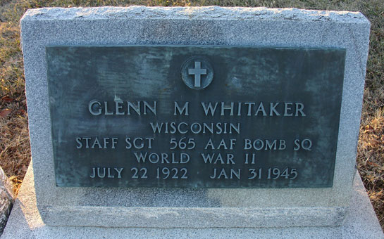 Right Waist Gunner - S/Sgt Glenn Max Whitaker USAAF (37619020), of Nevada, Vernon County, Missouri. Initially buried Cambridge Madingley Cemetery. Since buried in Newton Burial Park, Nevada, Vernon Co, Missouri, USA.