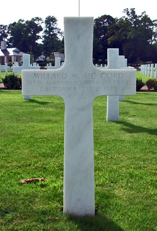 Willard McCord was born on 25th May 1924. In the 1940 US Census he is listed as being the youngest son of Charles and Bertha McCord of San Jose, Santa Clara County, California. His father Charles was born in Illinois and working as a plasterer, his mother was born in Ohio. The photograph of his grave was found on the internet and posted by Geoffrey Roecker.