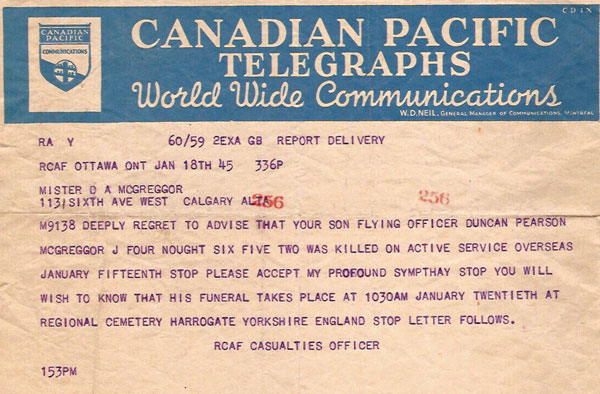 This is the offical telegram that Duncan McGregor's mother received informing her of her son's death in England. I have kindly been sent this copy